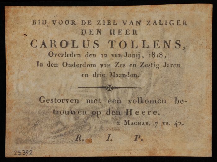 Bidprentje op de dood van Carolus Tollens, met zwart...