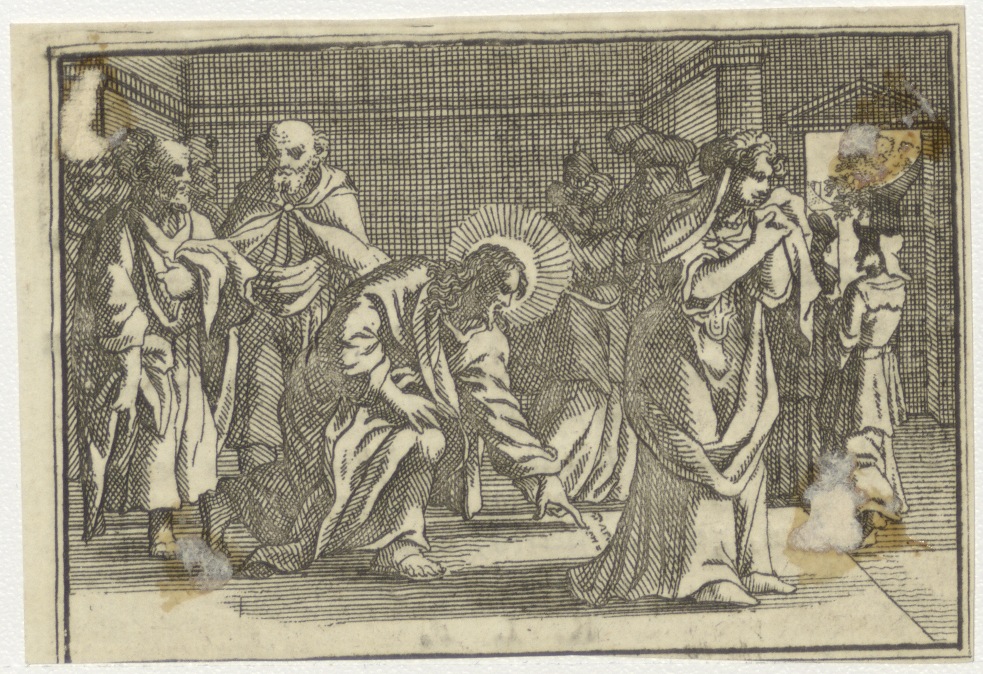 Christus schrijft in het zand: hij die zonder zonden...