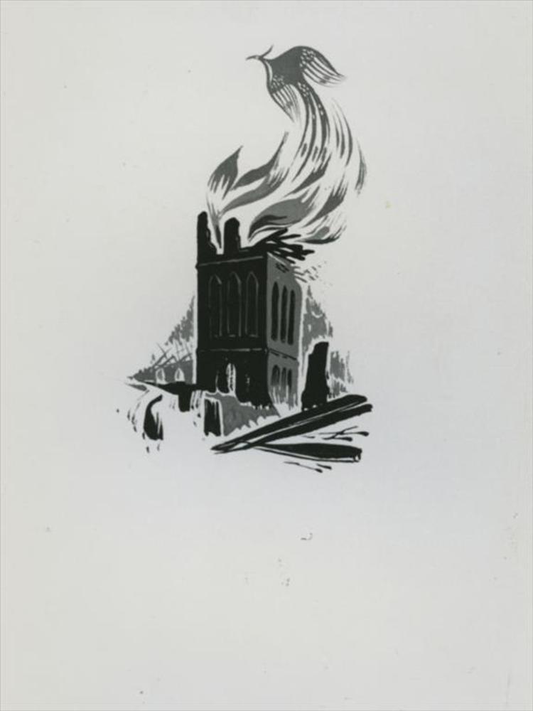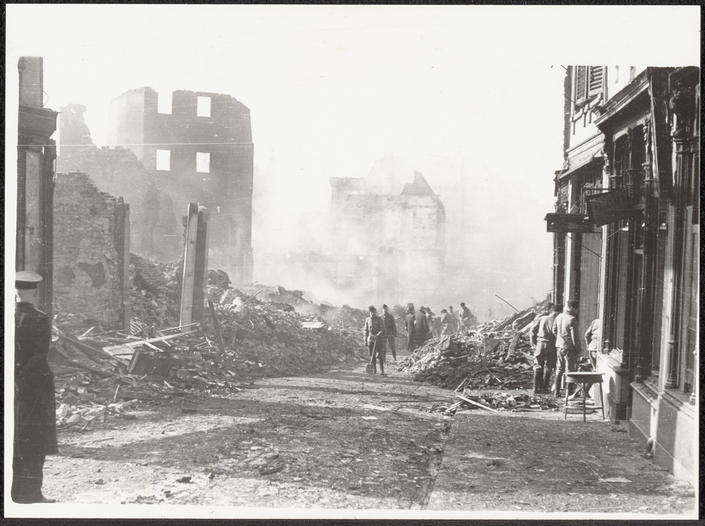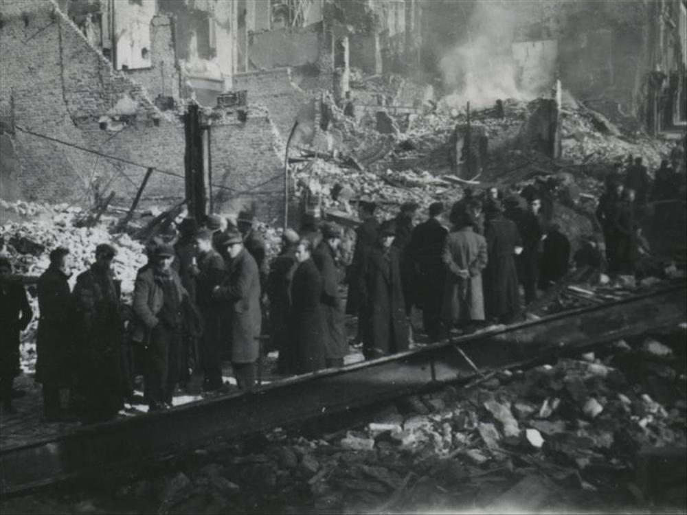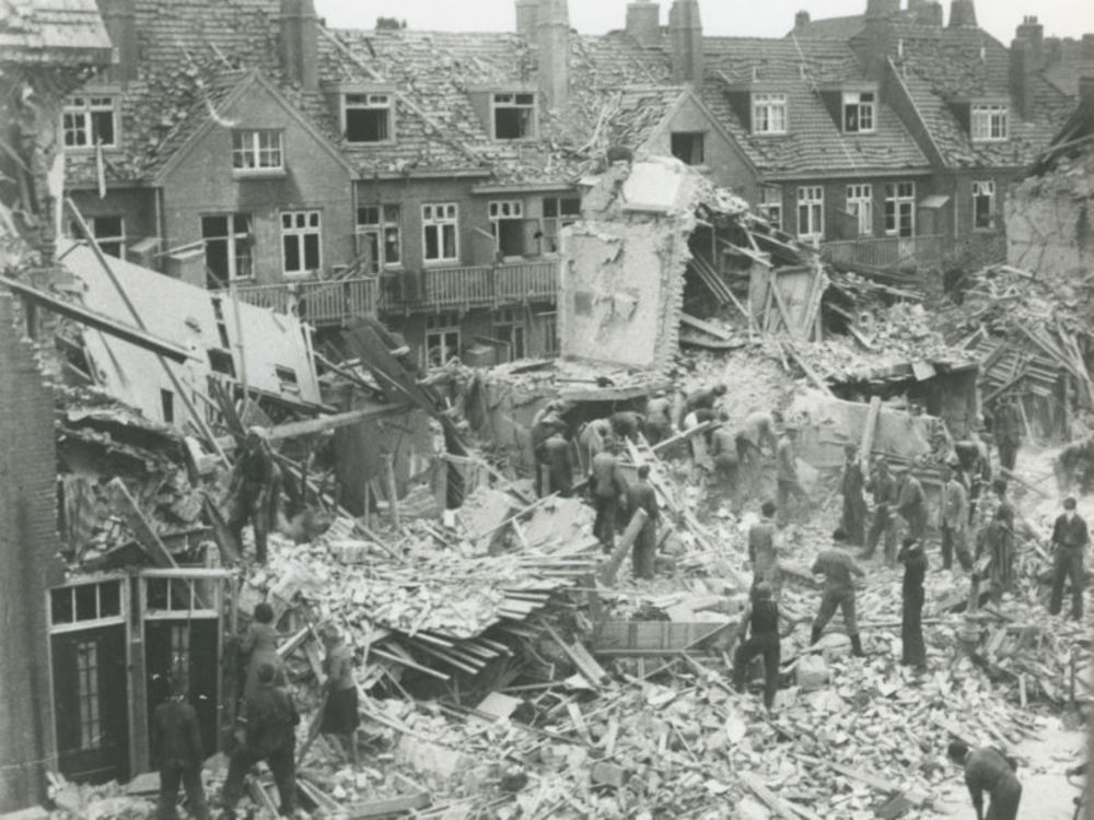Foto van puinhopen huizen in Amsterdam na bominslag....