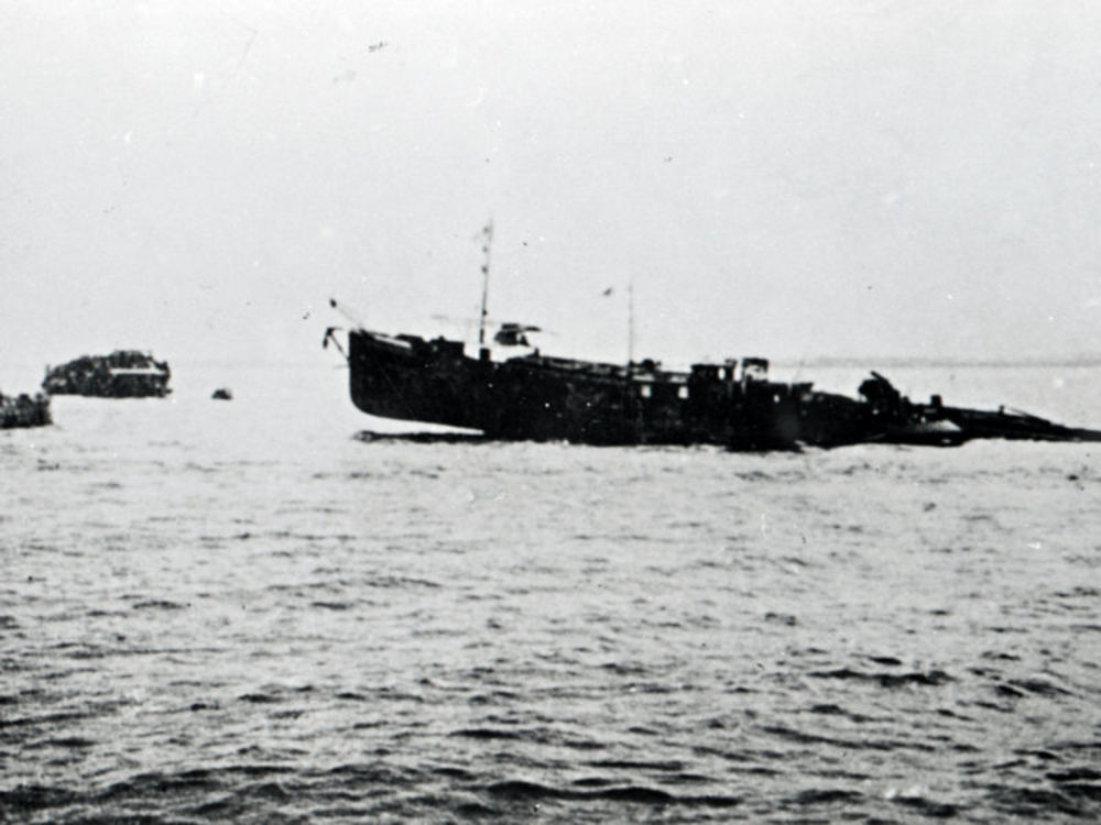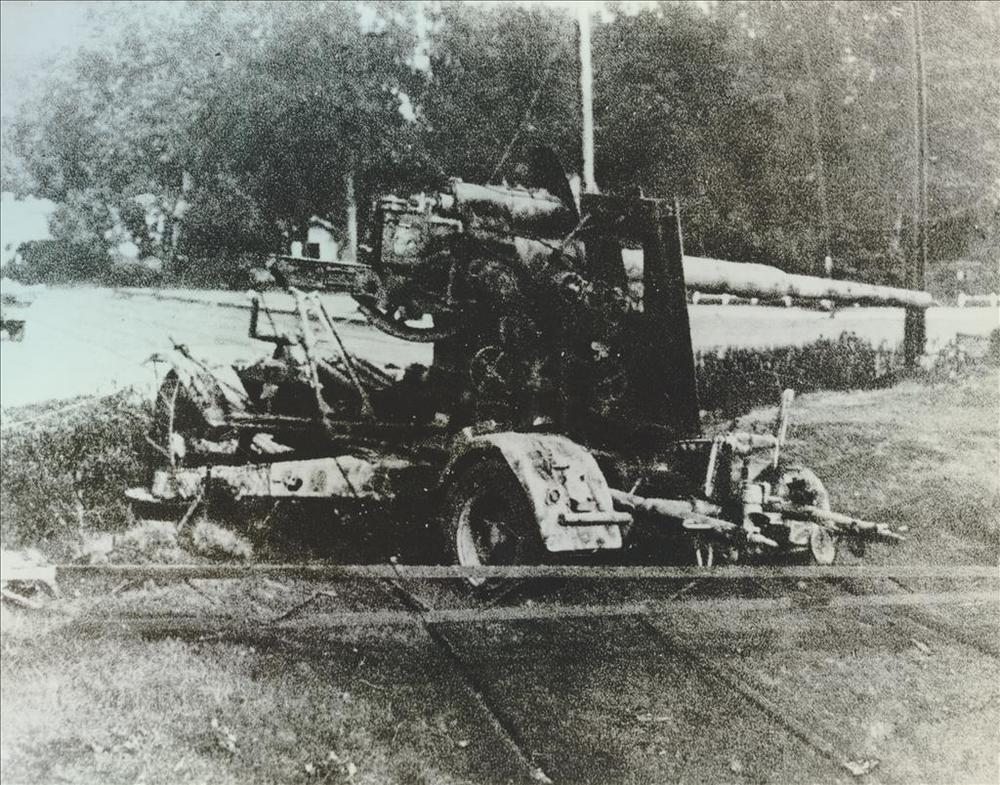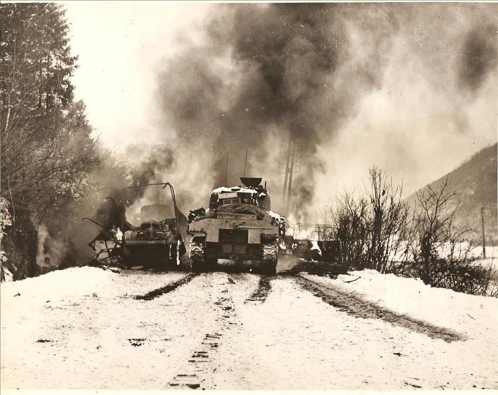 Shermantank te midden van brandende vrachtwagens