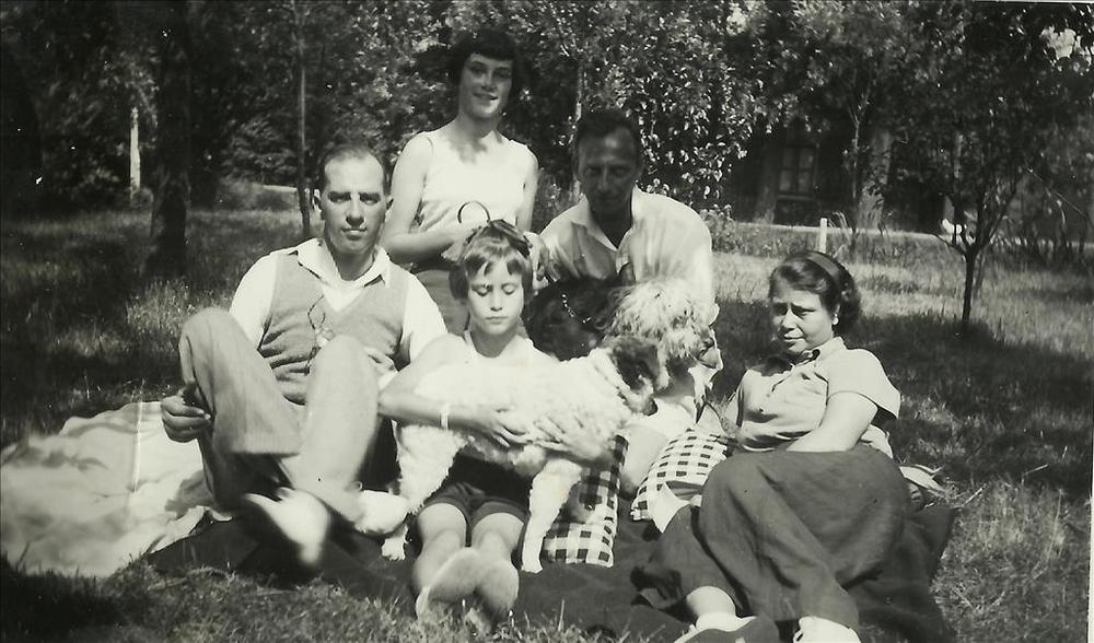 Joosten collectie: volwassenen, kind, hond, kleed, tuin