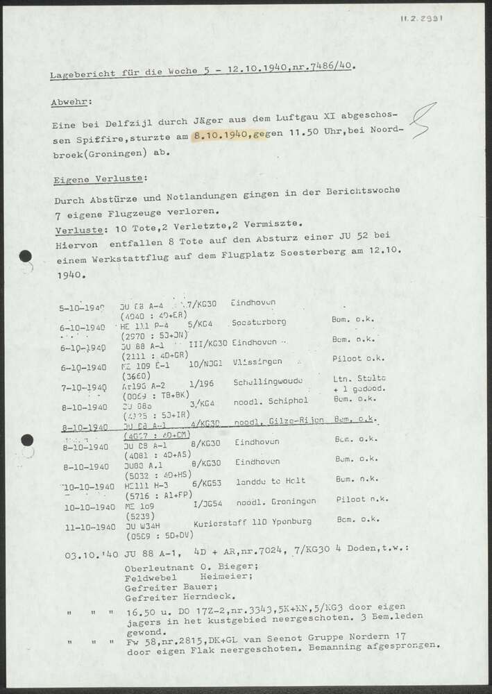 Lagebericht fúr die Woche 5 - 12-10-1940 nr. 7486/40.