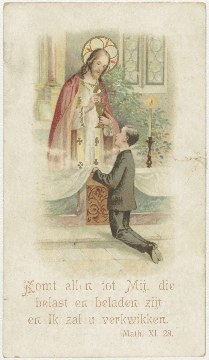 Communiecant (jongen) gaat ter Communie bij Christus...