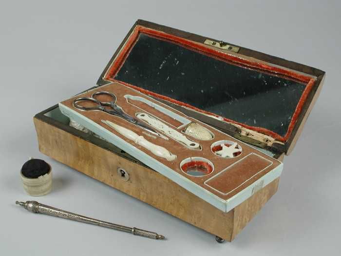 Kleine notenhouten naaikist met inlegdeel en diverse...