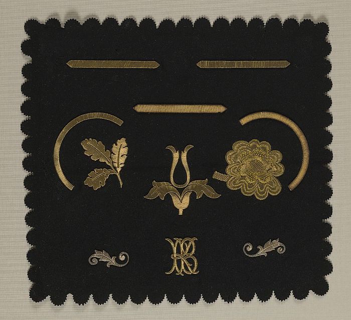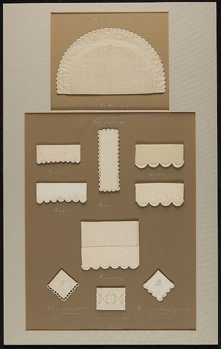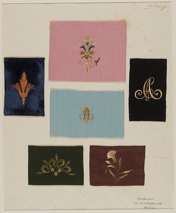 Proefstuk, zes verschillende borduursels op verschil...