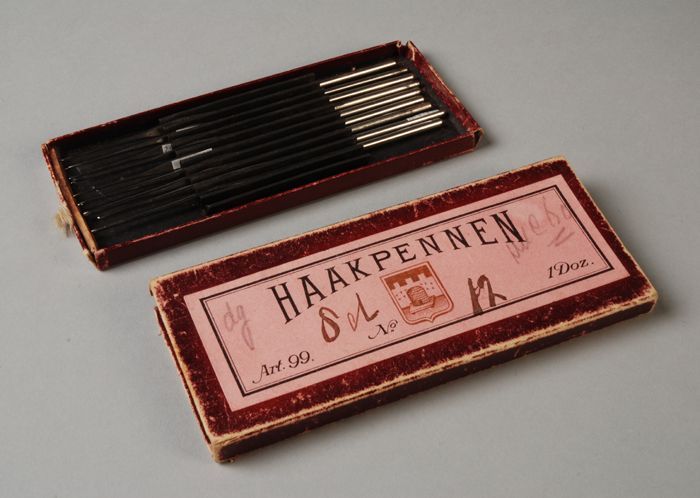 Haaknaald met metalen haakdeel en handvat van been o...