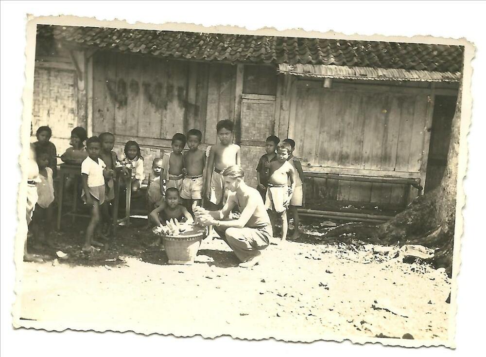 KNIL solaat met bananen bij groep Indonesische kinde...