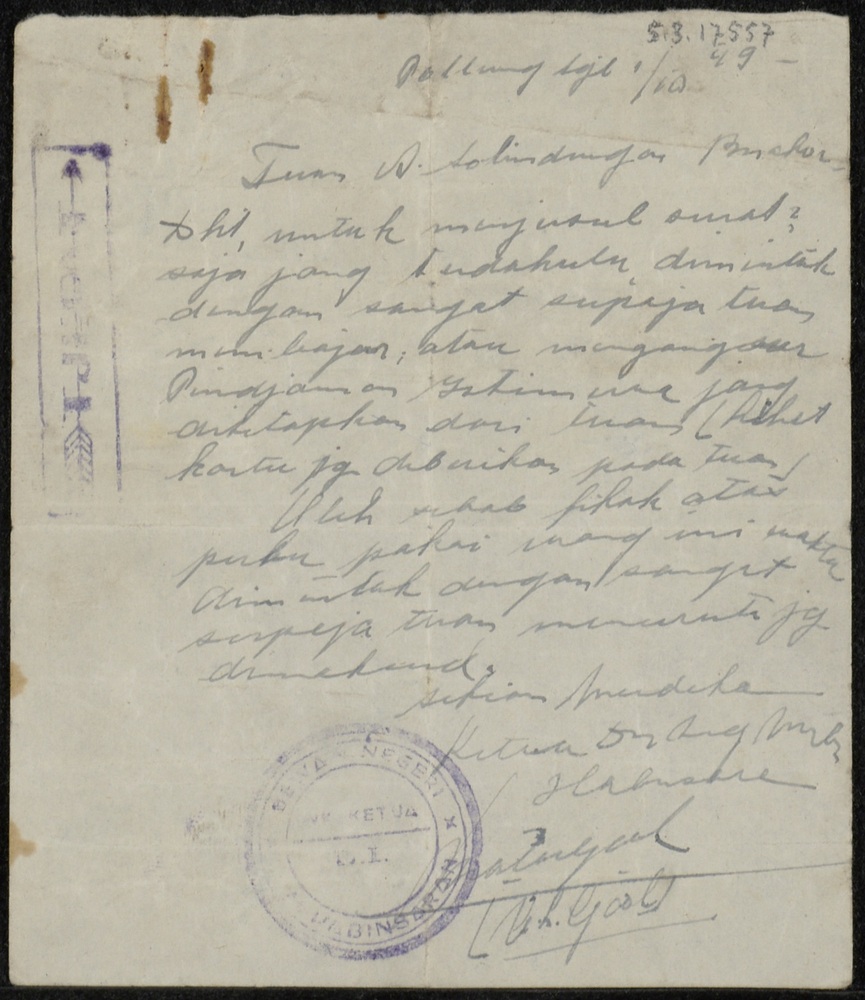 Handgeschreven briefje in het maleis, d.d. 1 oktober...