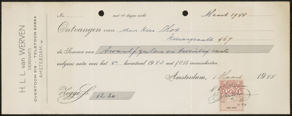 Kwitantie van H.L.L. van Werven Dierenarts te Amsterdam