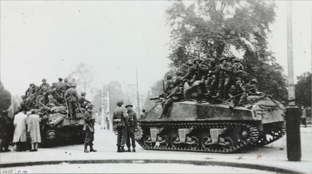 Nijmegen, Keizer Karelplein, Tanks met Britse soldaten