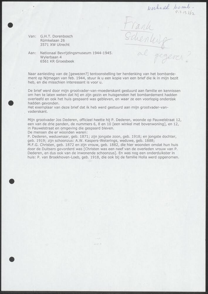 Brief van Jos van Dederen, Ruysdaelstr 40 Nijmegen.
