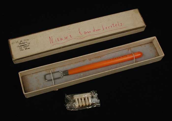Tandenborstel met oranje plastic handvat en in plast...
