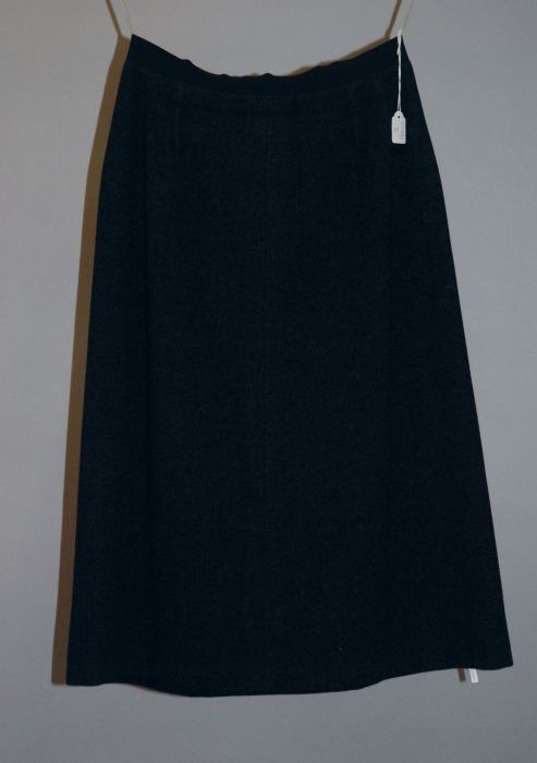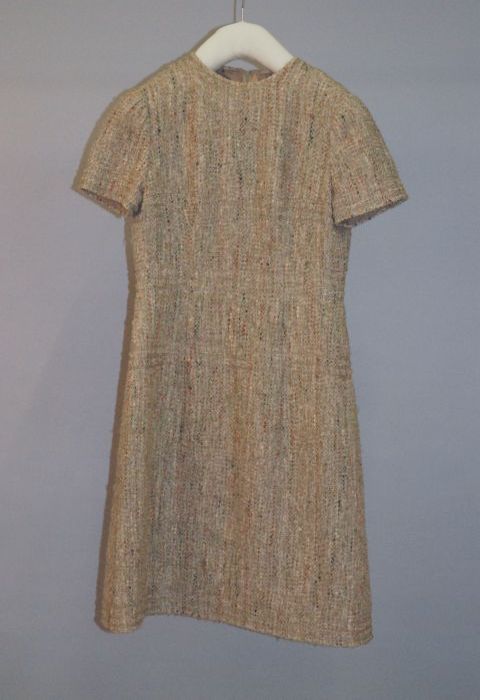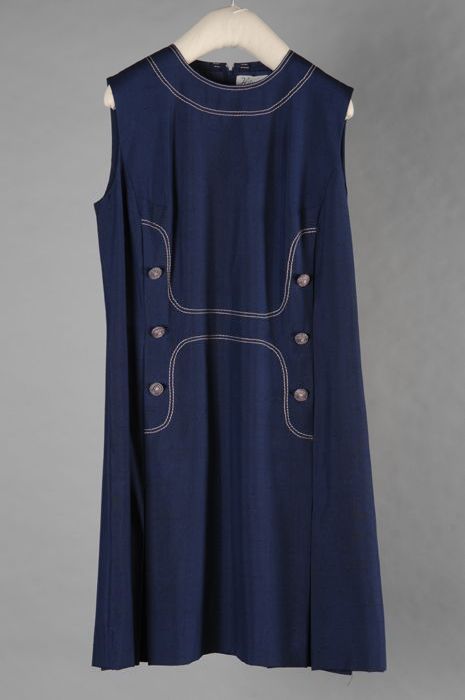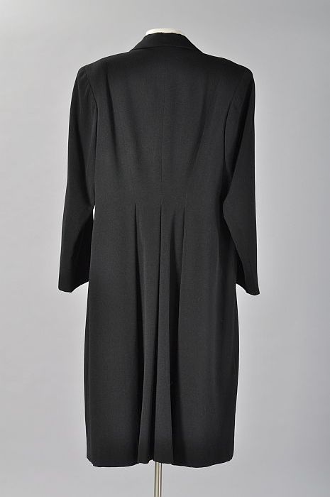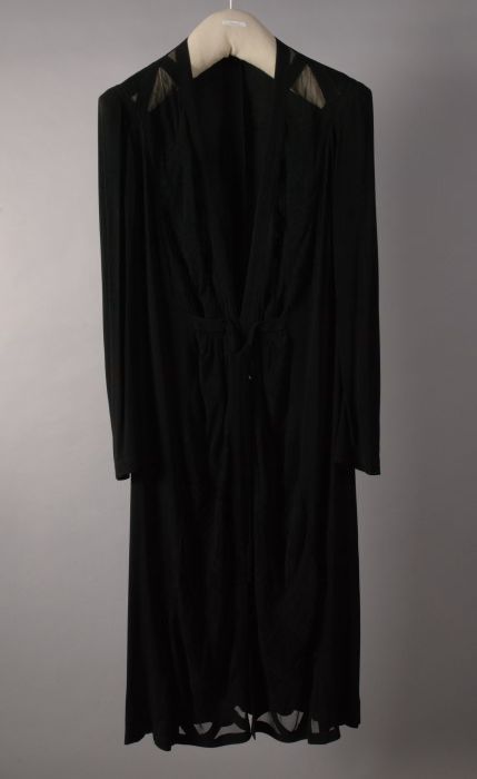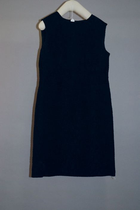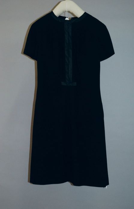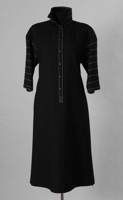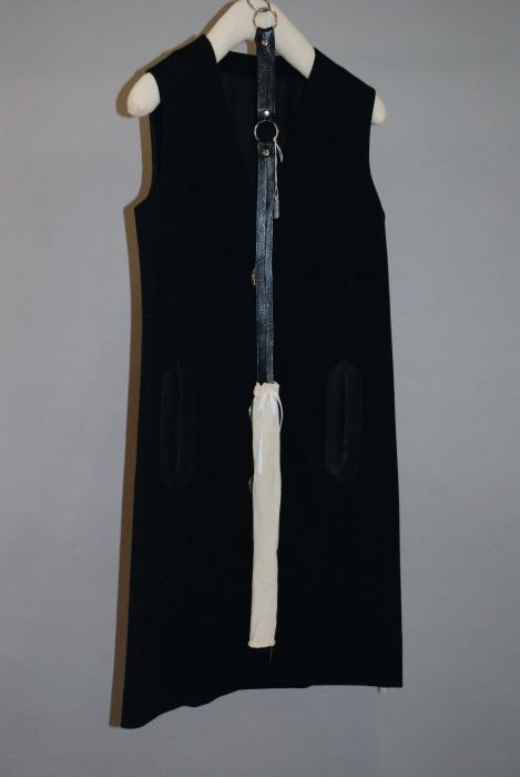 Zwarte wollen jurk of tuniek met witte stiksels, kno...