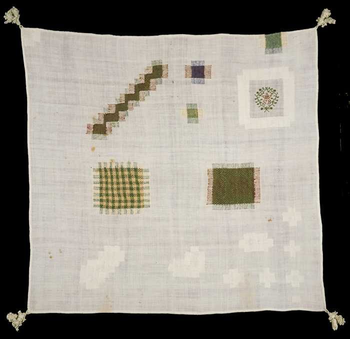 Borduurproef, fragment van een wit katoenen laken me...