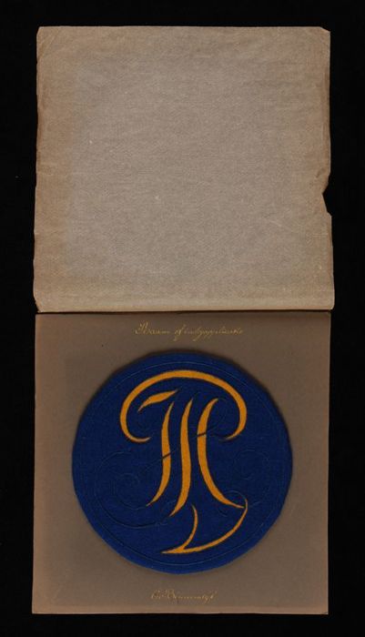 Borduurproef, cirkel blauw laken en geel vilt, "Raam...