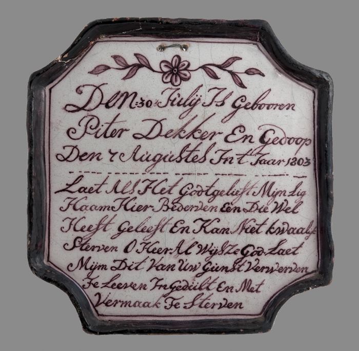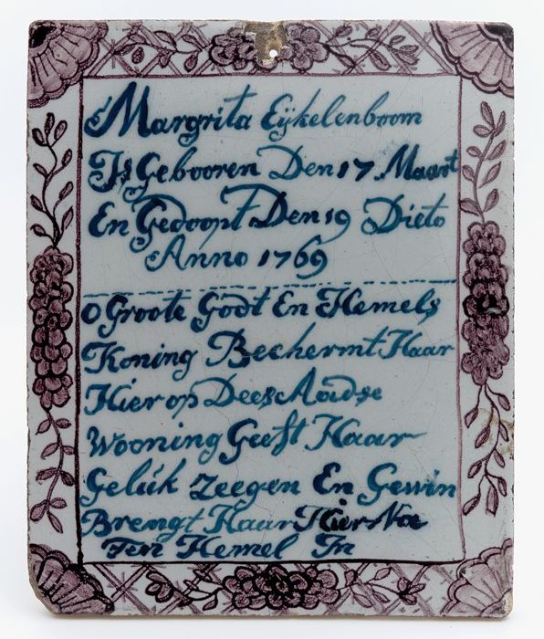 Rechthoekige geboortetegel, paars en blauw op wit, m...