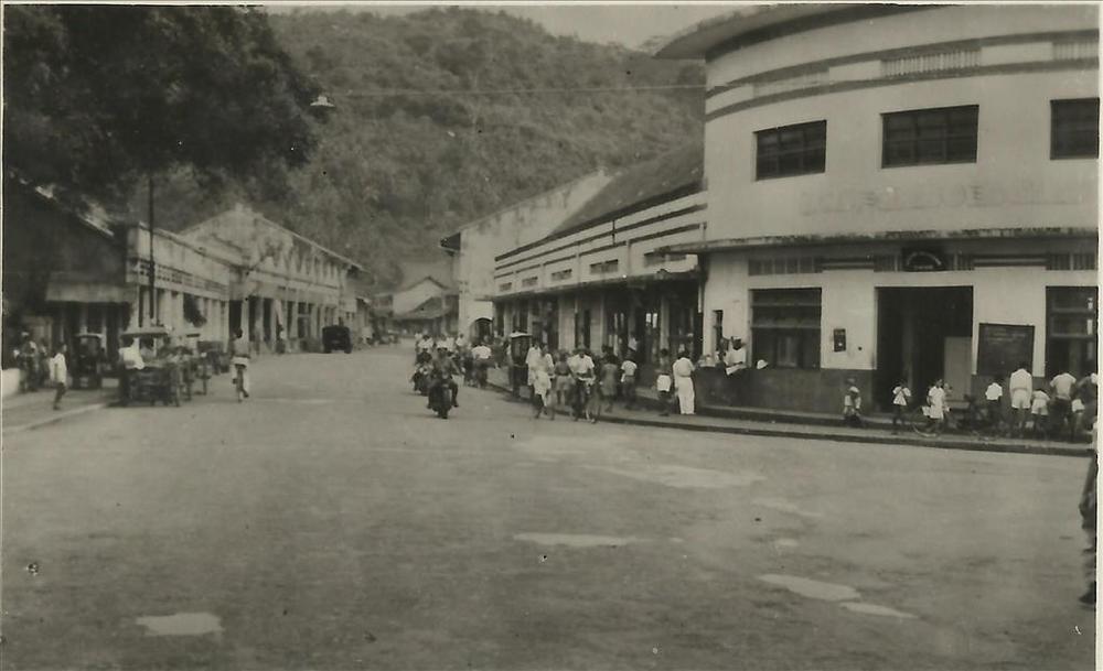 Ned. Indië na WO 2; straat, gebouw, berg