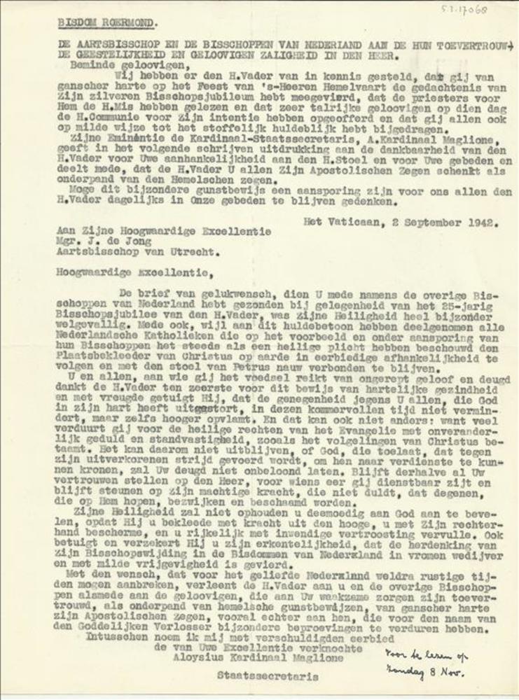 Brief van het bisdom Roermond over dankbrief van kar...