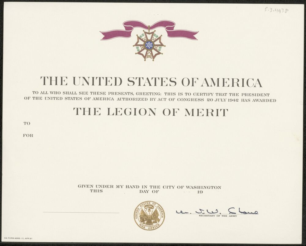 Amerikaans : Verlening Legion of Merit, Gesigneerd d...
