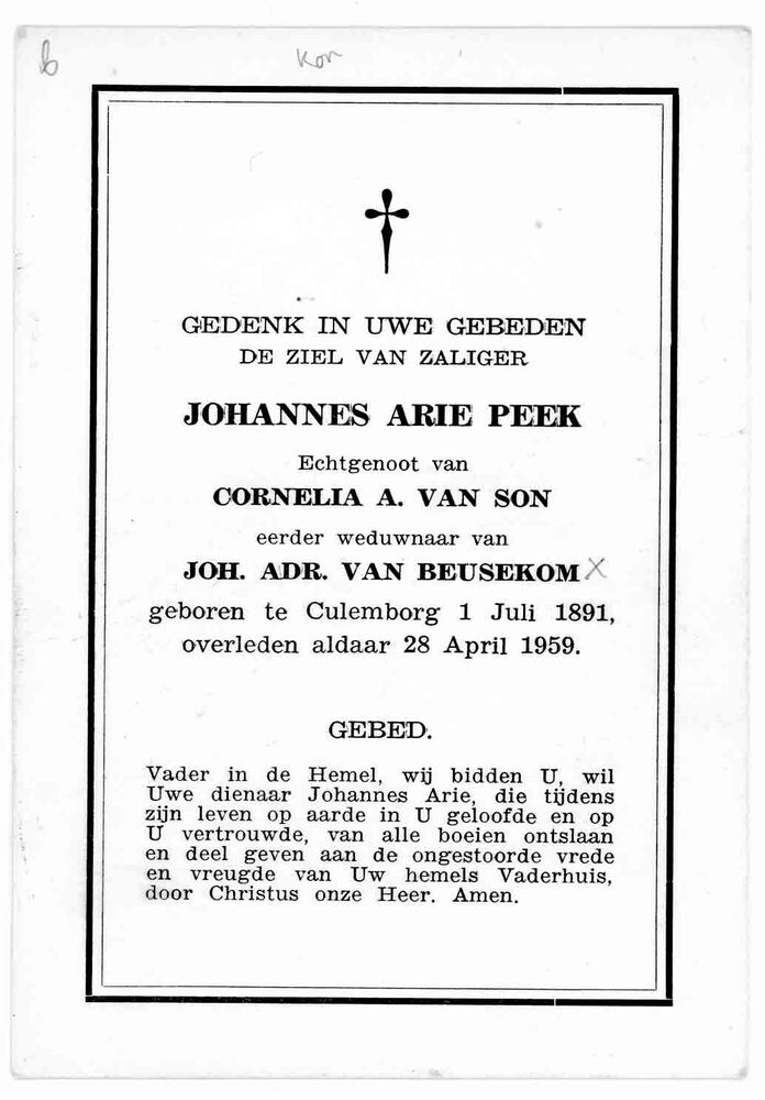 bidprent voor Johannes Arie Peek. Geboren 01-07-1891...