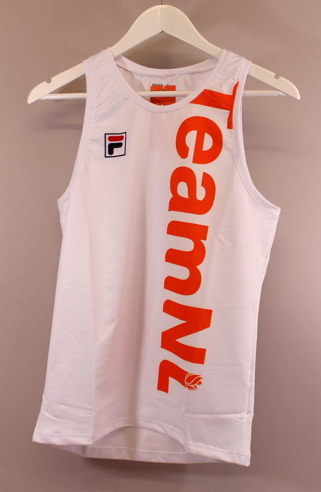 Mouwloos sporthemd wit met opdruk en kleuraccenten. ...