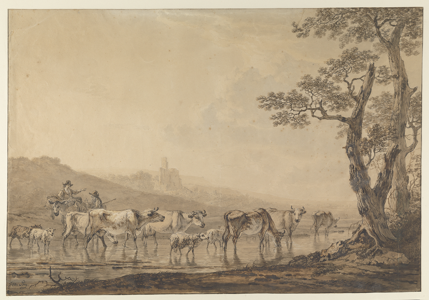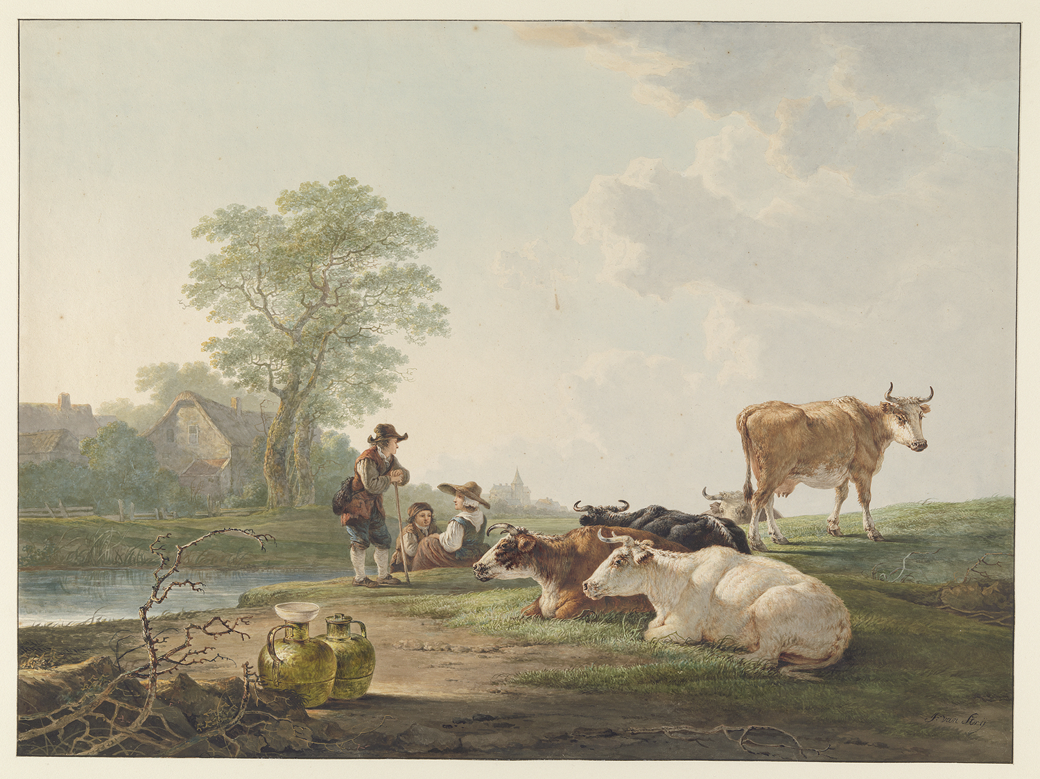 Landlieden bij rustend vee, in een Hollandsch landschap