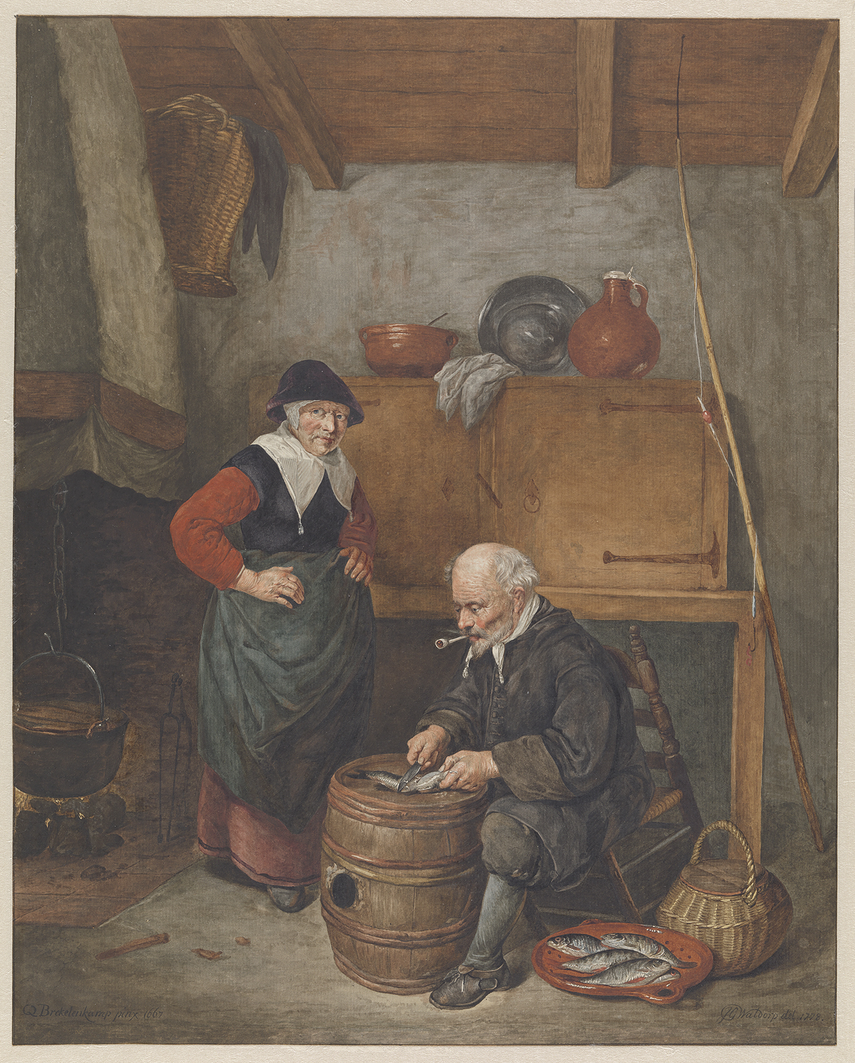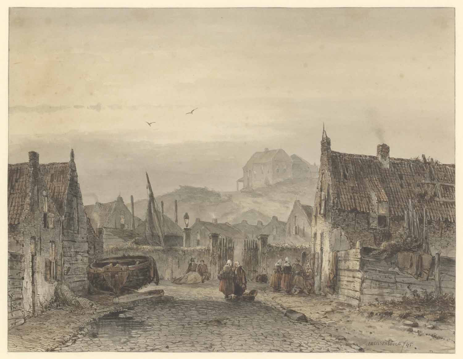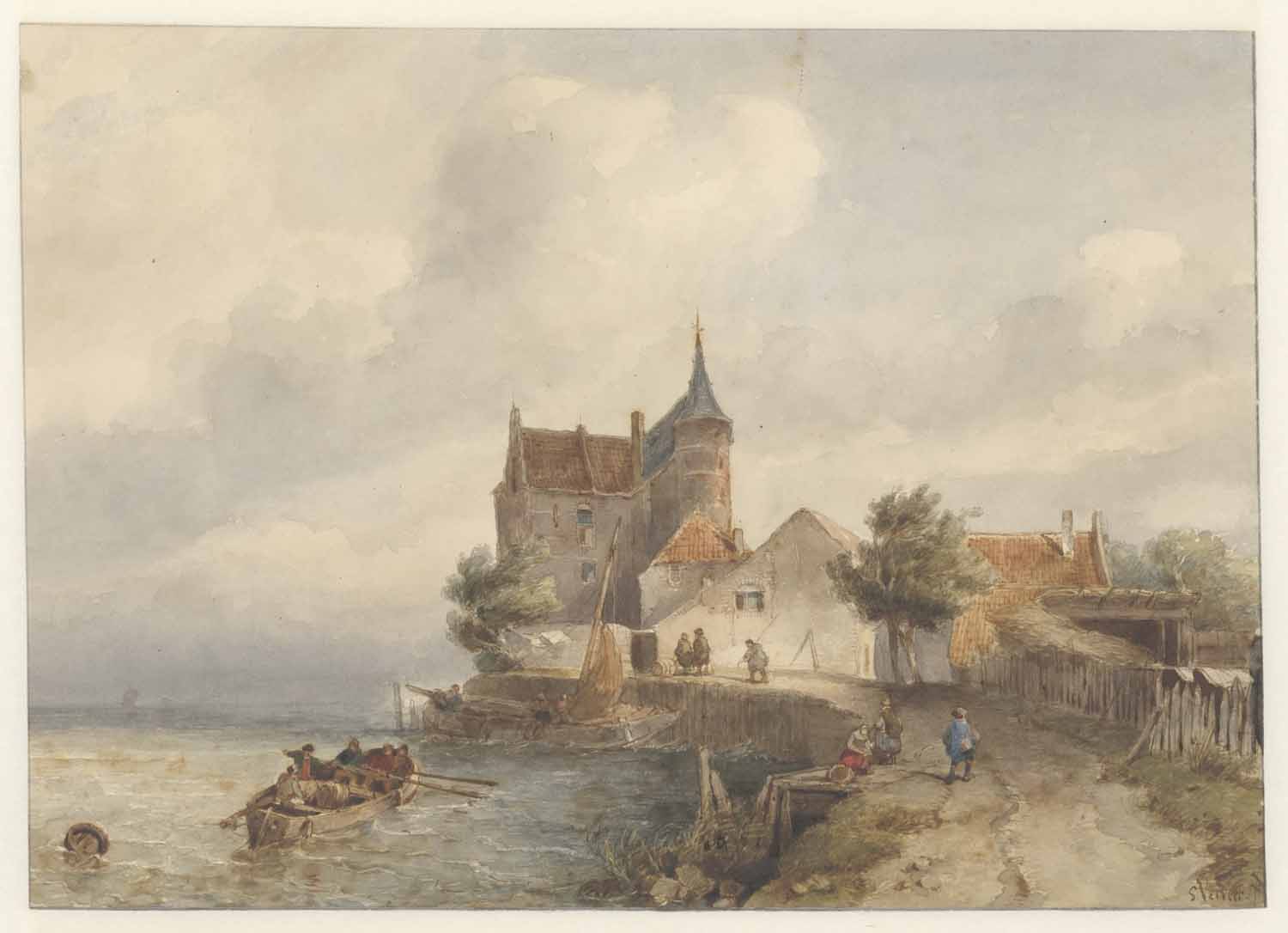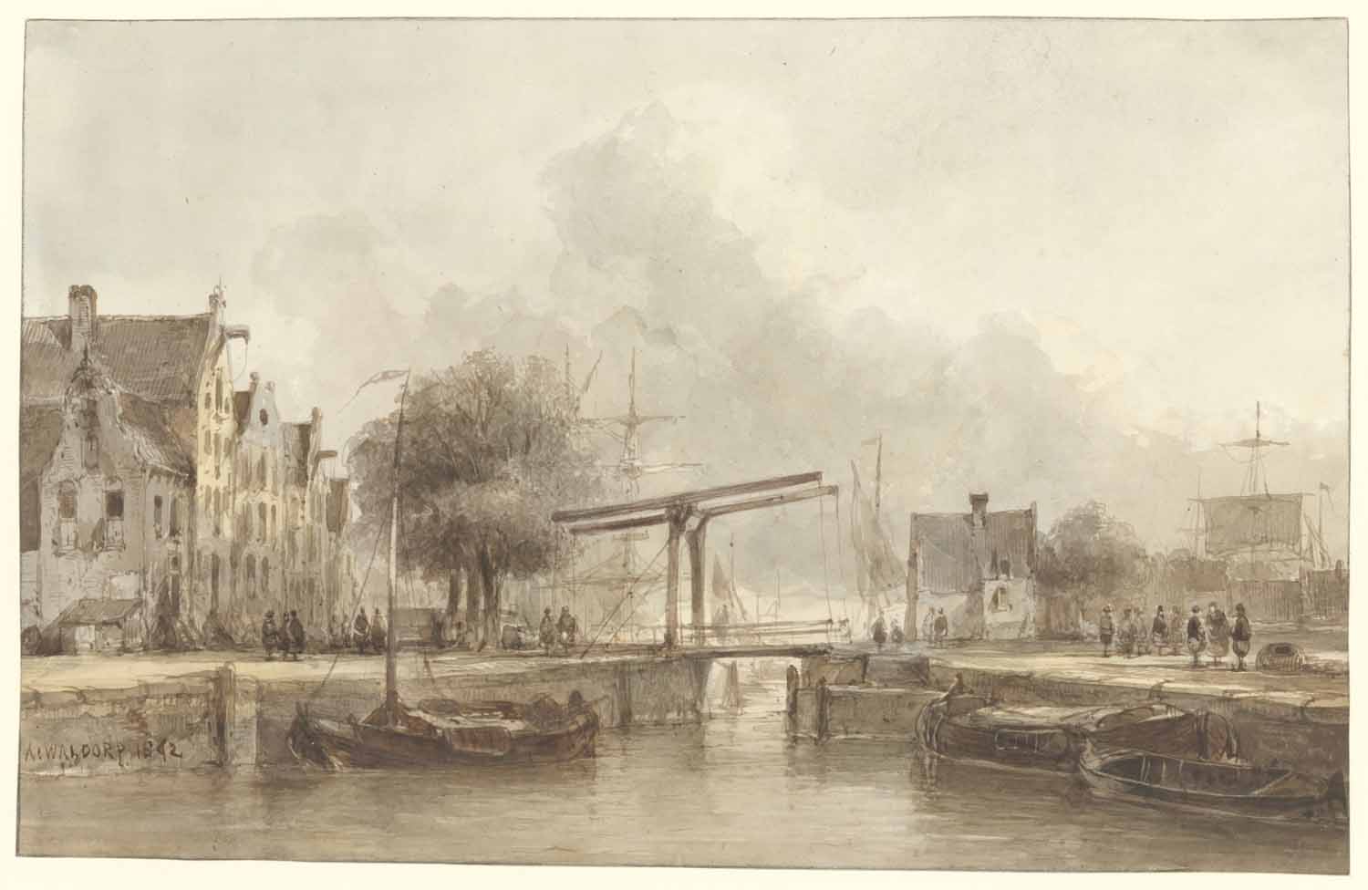 Een stil water; op den voorgrond eene haringbuis