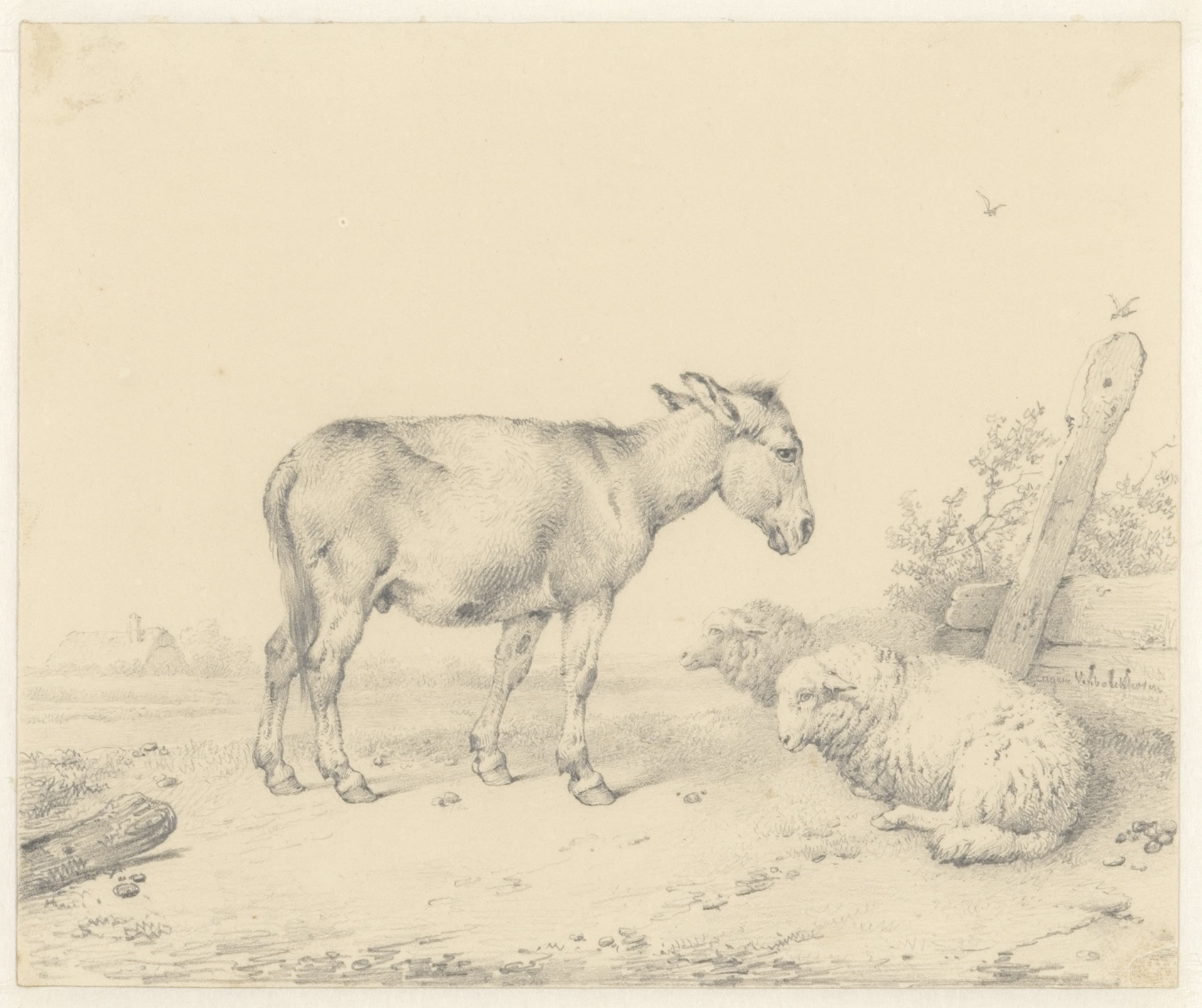 Een staande ezel bij twee liggende schapen