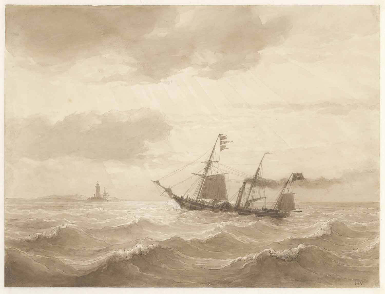 Een woelend water met eene stoomboot