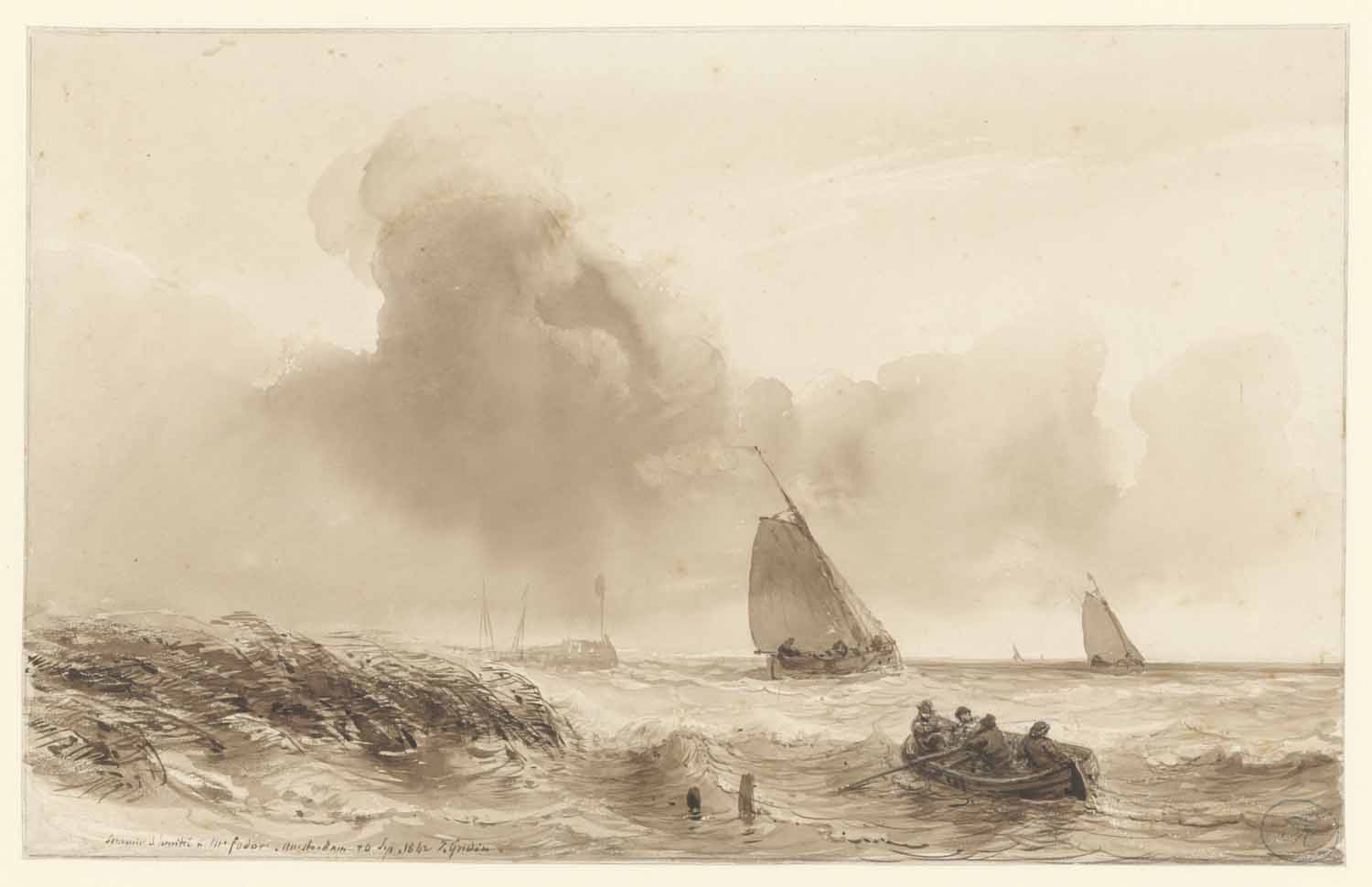Een woelend water met verschillende schepen, links e...