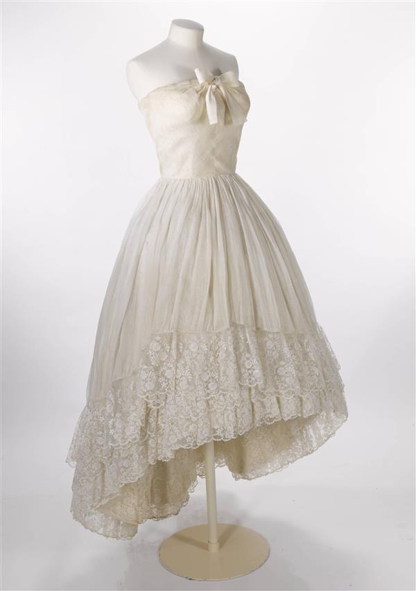 Avondjurk, strapless model van wit katoenen organdi ...