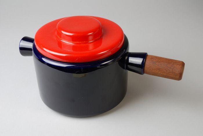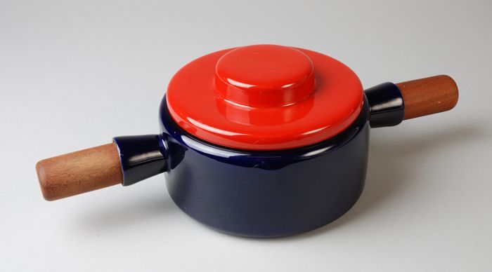 Grote kobaltblauwe ovenschaal (A) met rode deksel (B...