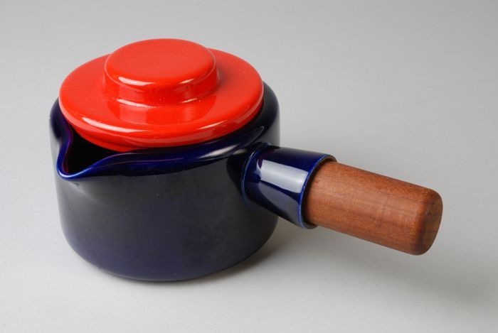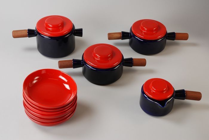 Middelgrote kobaltblauwe ovenschaal (A) met rode dek...
