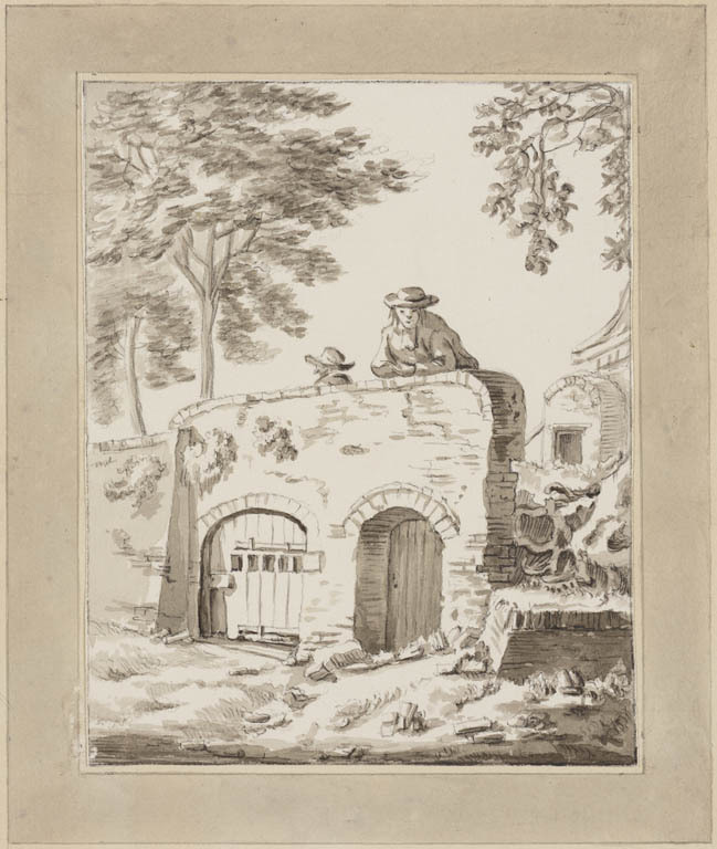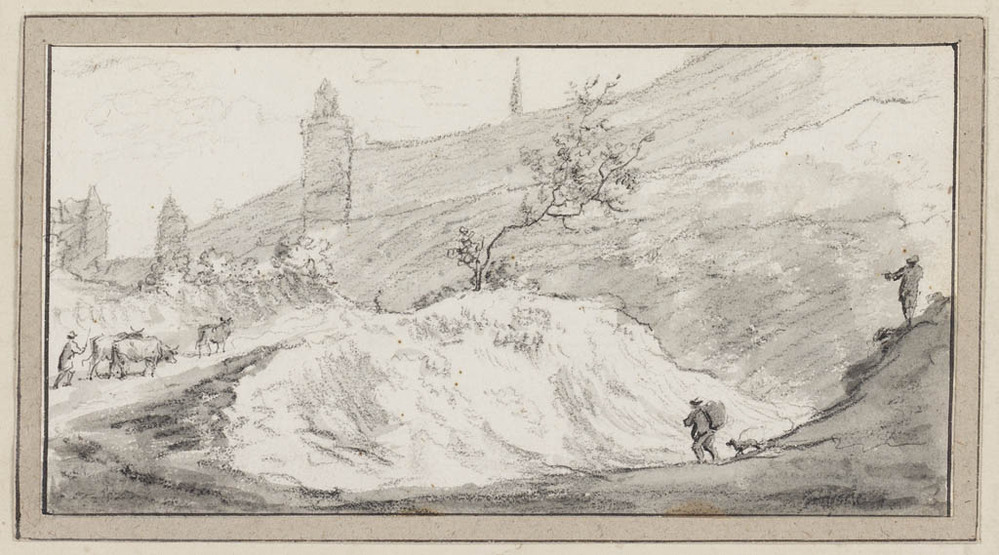 Stadsmuur met zandweg met figuren