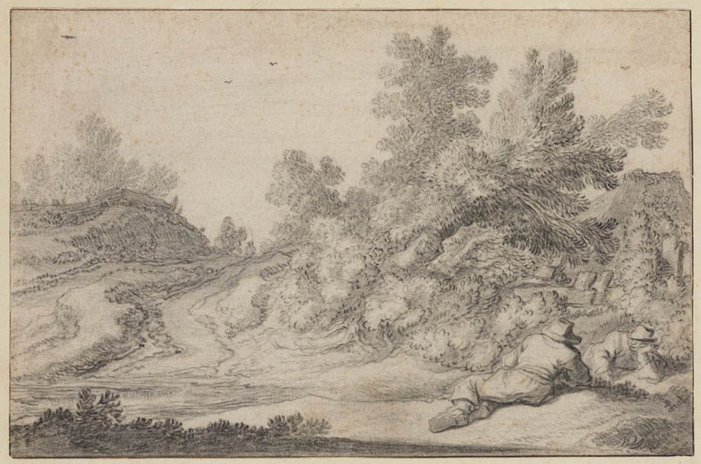Twee liggende mannen in een landschap