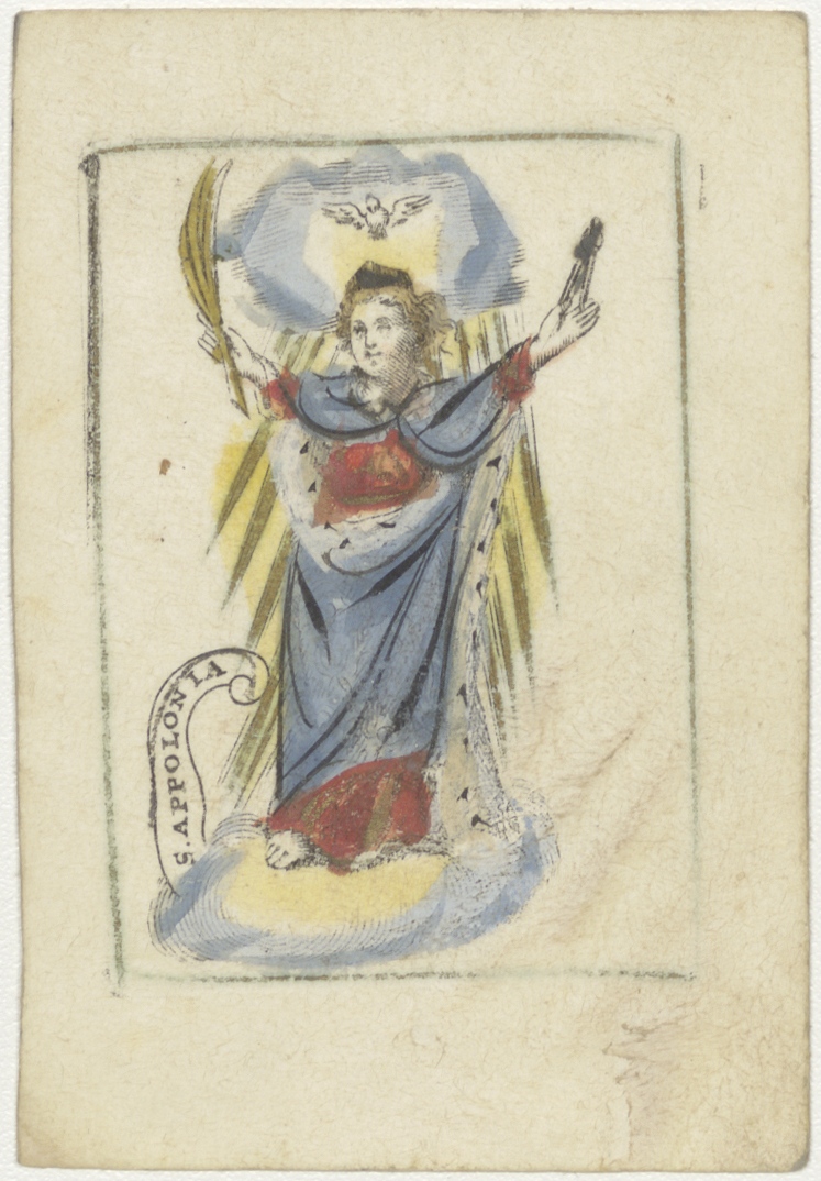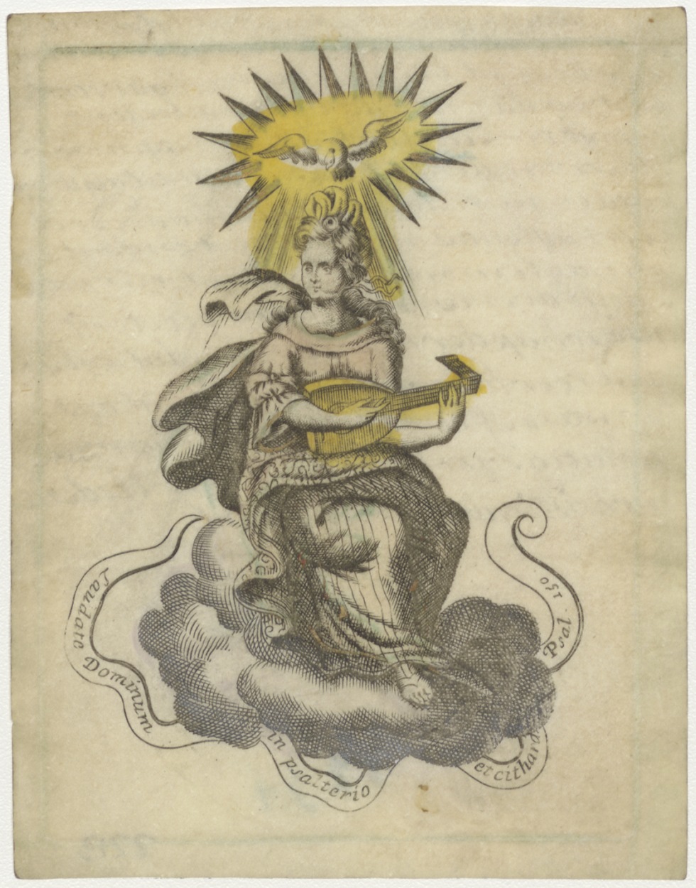 Op luit spelende heilige(?), ingekleurd, kz. tekst;1...