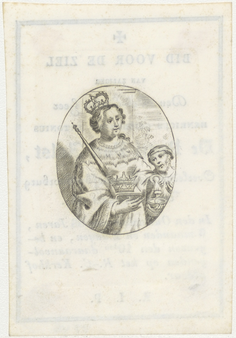 Religieuze heilige(?) aanbidt Christusbeeld, kz. Bid...