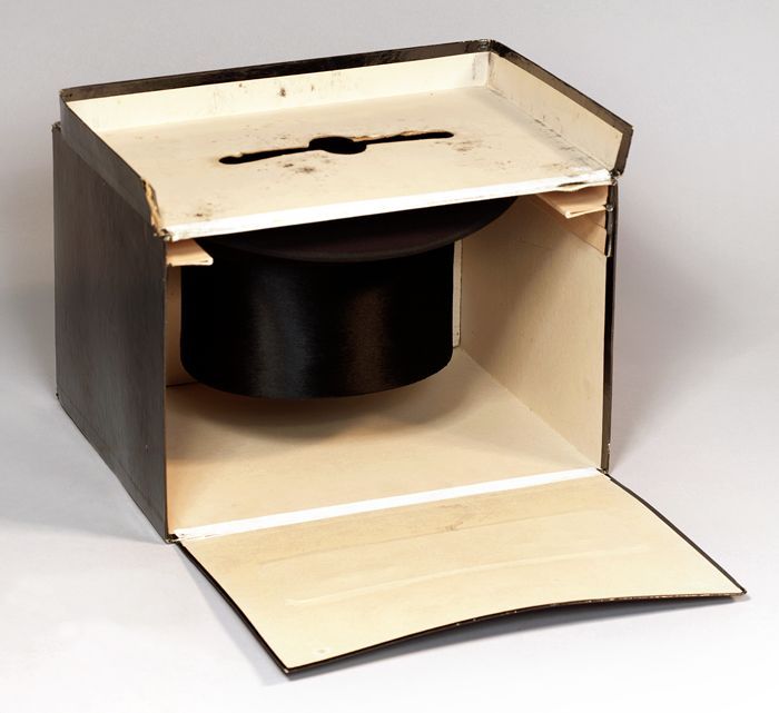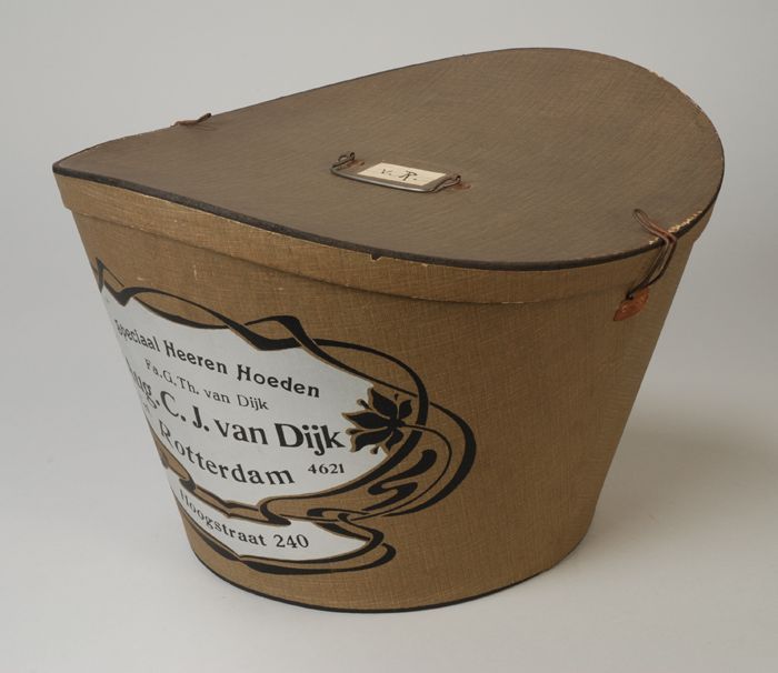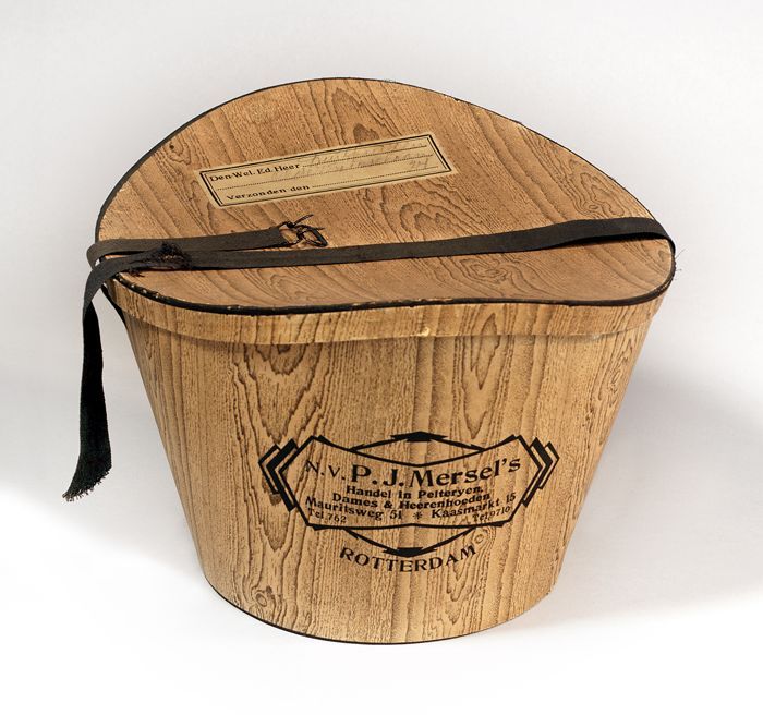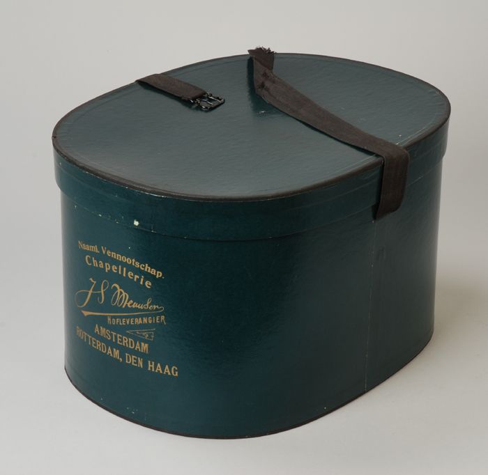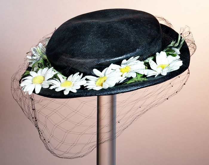 Ronde dameshoed met zwarte bol, achter een opstaande...