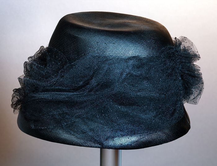 Zwarte dameshoed van gladstro met garnering van tule...