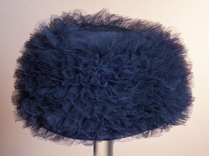 Donkerblauwe ronde dameshoed, platte bol zonder rand...
