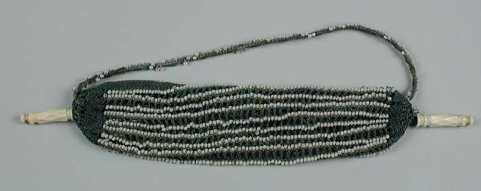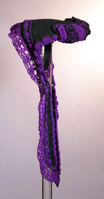 Zwart en paars wollen gebreid mutsje, driehoekig, vo...