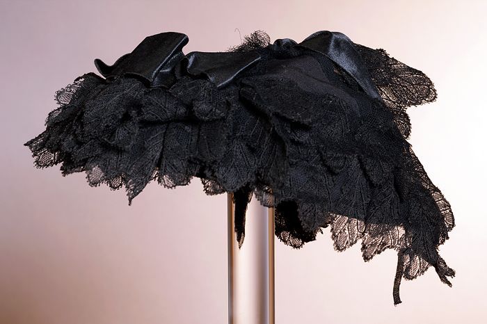 Zwarte dameshoed, afgezet met zwart kant en lint, bo...