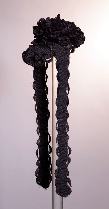 Kapje van zwart glanzende wol gebreid, garnering van...