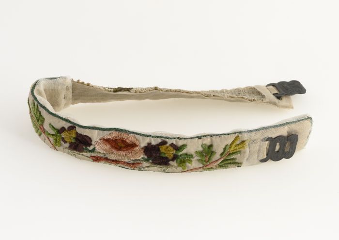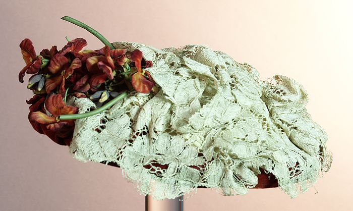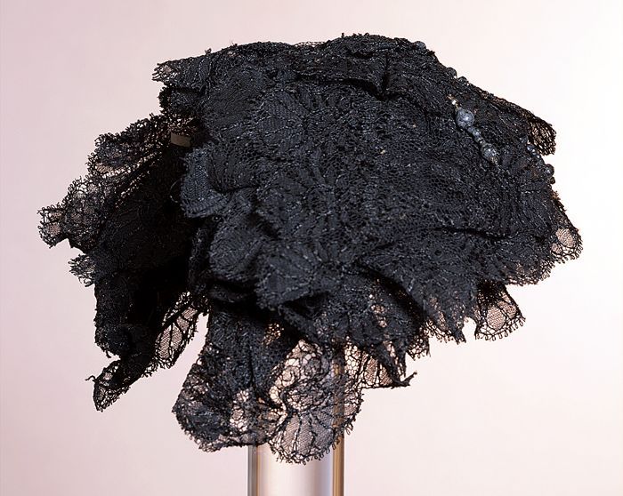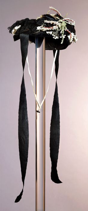 Kapje, ovaal met zwart lint, kant, bloemen en blader...