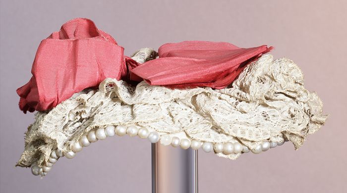Dameshoed van rood velours en crèmekleurig kant, gar...