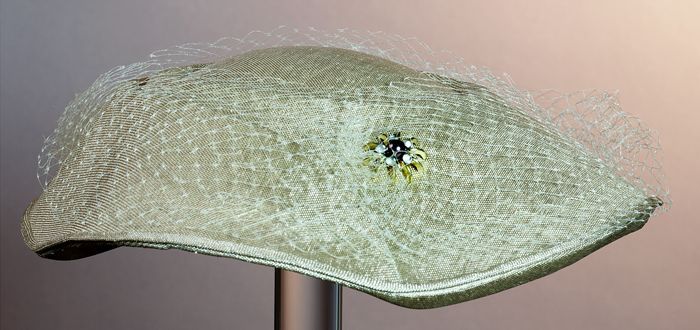 Dameshoed van beige stro, met beige voile, broche in...