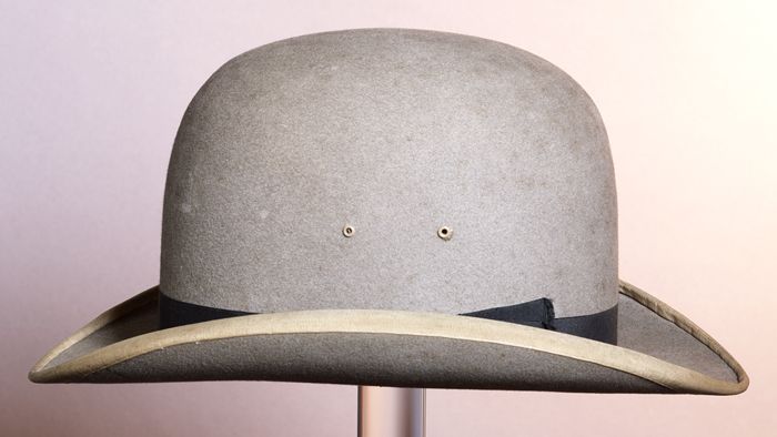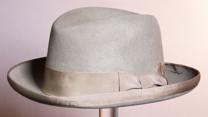 Grijze vilten herenhoed met gleuf in de bol, iets op...