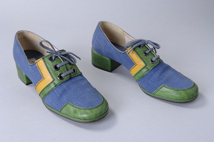 Blauw, groen en gele veterschoen met spijkerstof, "B...