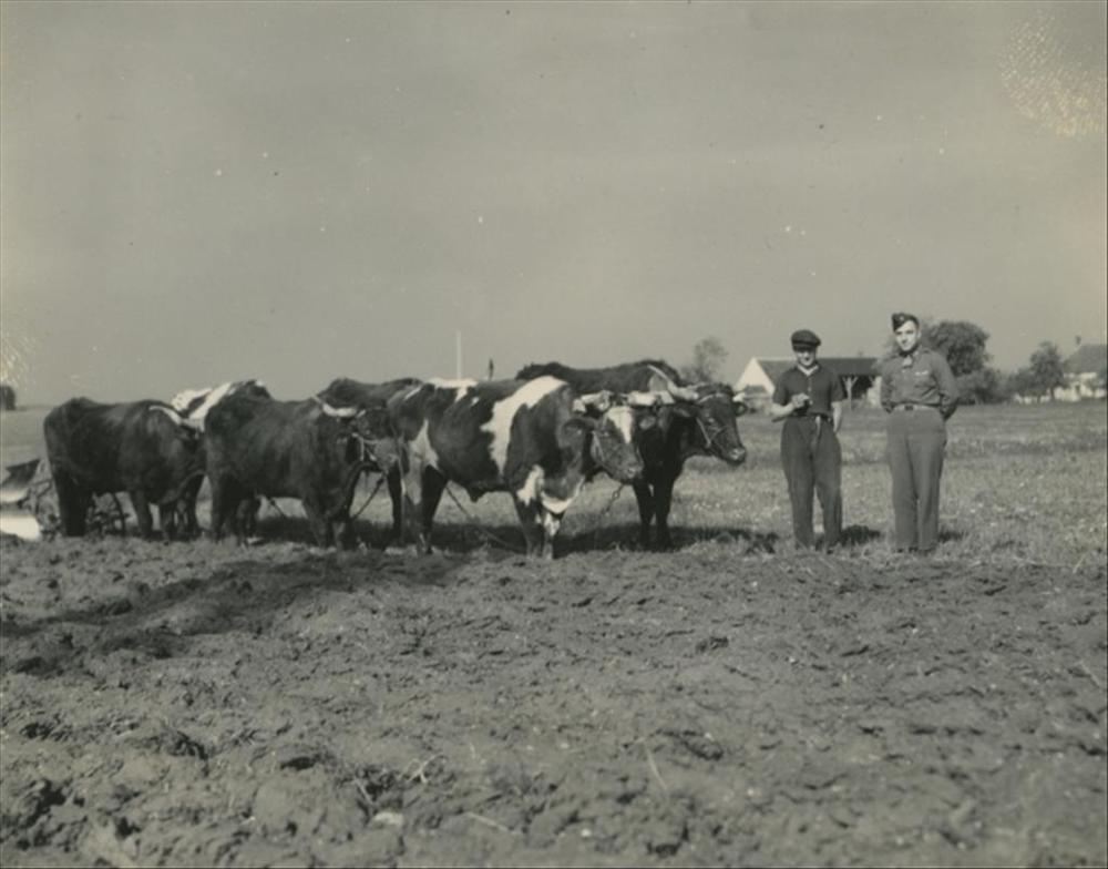 Amerikaanse militair bij span met zes ossen