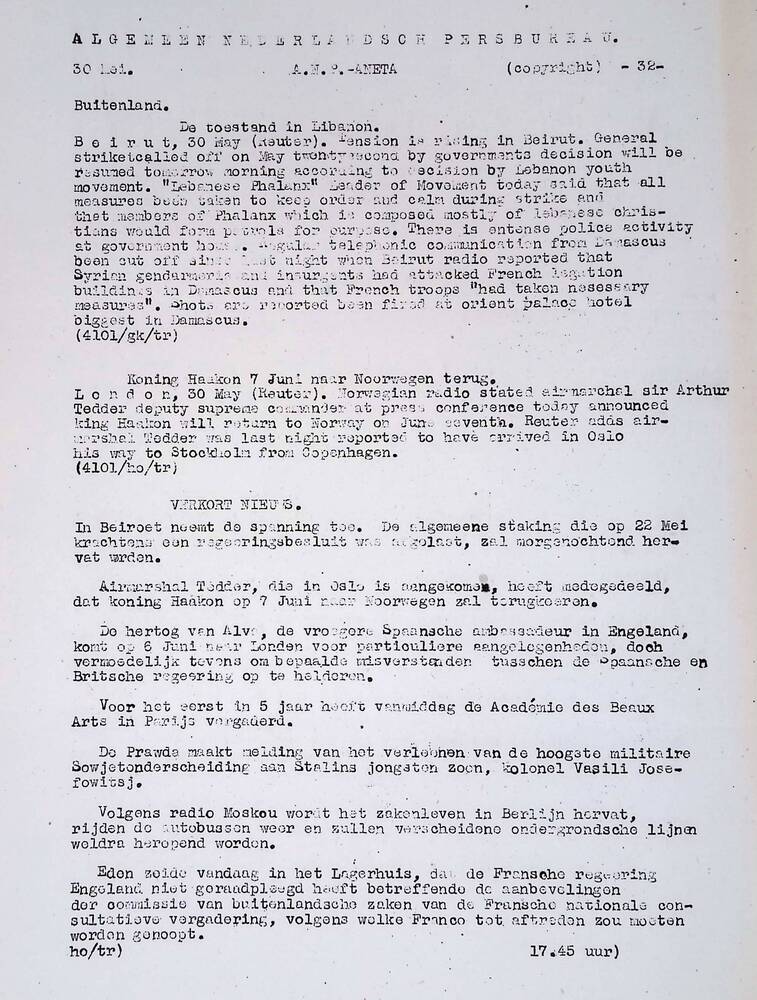 Algemeen Nederlandsch Persbureau, mededelingen, 30 m...